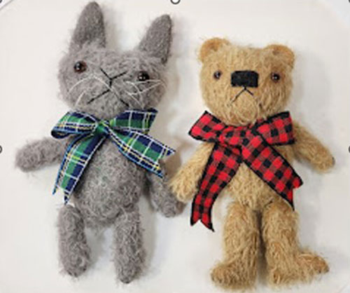 Consider as a blank canvas to choose and complete a prim-style wobble-jointed "Theo" 8 inch mohair bear or "Hopper" 9 inch mohair rabbit. The kit will include: A pre-double jointed bear or rabbit, 1 pair glass eyes, stuffing, thread, ribbon for bows and/or accessories.